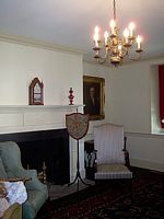 Mrs. Muriel Embler-Hill provided the funds, and supervised the restoration and decoration of this room. Many of the fine antiques on display here were given by Mrs. Hill in memory of her friends and neighbors. The furnishings are a mixture of periods. The Bohemian glass jars on the mantel were given in memory of Mr. C. Fred Fowler. Mrs. Hill was Muriel Gregory before marrying and when she died, she bequeathed the Society the beautiful Dutch lowboy from her Gregory family. Other items of interest include the wing chair, the Federal style convex mirror, and the slant-top desk signed by Mr. Thomas Burling, a furniture maker noted for his desks. The melodeon, given by Mr. Joseph Trickett, was a popular parlor instrument of the mid-1800s. It is a reed organ; the pedals must be pumped to produce the air supply. The embroidered fireplace screen is adjustable. The sofa is from the Victorian period. The secretary is Empire; it is from the Nicholl collection. A few pieces of Rockingham china are displayed on it. The portraits are of Samuel B. and Anna Storm Thomson, grandparents of Bessie Newkirk Estile, an early member of the Society.