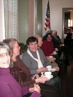 The Society uses the Meeting Room as our main meeting area. We meet on the third Wednesday of the month in the Spring and Fall; with special events in Summer. Meetings are open to the public. The shallow working fireplace is one of three on this floor set triangularly back-to-back. There is a huge stone base in the cellar that supports these fireplaces. The three flues come together in a common chimney, part of which you will be able to see in an upstairs bedroom. The fireplace had been partially destroyed when this house was converted into two apartments; the Society had it rebuilt as part of the restoration of the house. The mantel was salvaged from an old house near Pine Bush that was being demolished. The copper kettle, a gift from Mr. Joseph Trickett, one of the founding members, is hanging on a cooking crane. The crane and andirons are early 18th century fireplace equipment.